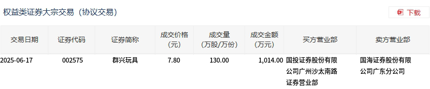 群兴玩具今日大宗交易折价成交130万股,成交额1014万元