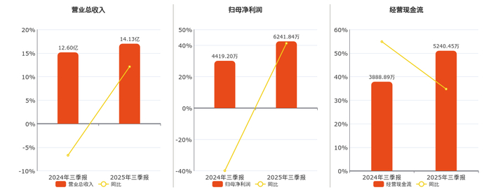 公司营业总收入为14.13亿元。归母净利润为6241.84万元。经营活动现金净流入为5240.45万元。