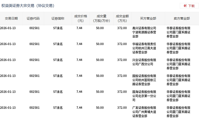1月13日,ST未名大宗交易成交300万股,成交额2232万元,占当日总成交额的16.77%,成交价7.44元,较市场收盘价7.99元折价6.88%。