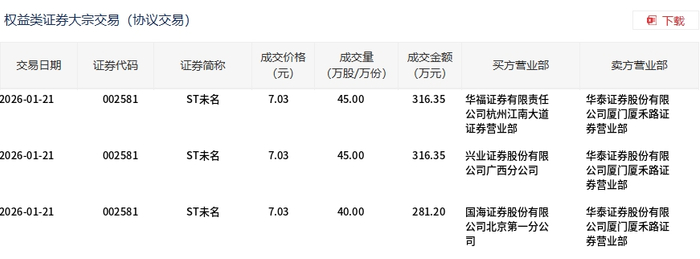 1月21日,ST未名大宗交易成交130万股,成交额913.9万元,占当日总成交额的24.83%,成交价7.03元,较市场收盘价7.39元折价4.87%。