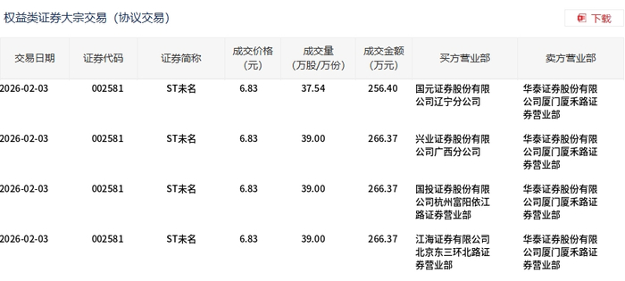 2月3日,ST未名大宗交易成交154.54万股,成交额1055.51万元,占当日总成交额的21.38%,成交价6.83元,较市场收盘价7.55元折价9.54%。