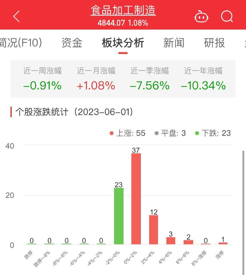中国经济网北京6月1日讯 今日,食品加工制造板块整体涨幅1.08%,其中,55只股票上涨,3只股票平盘,23只股票下跌。