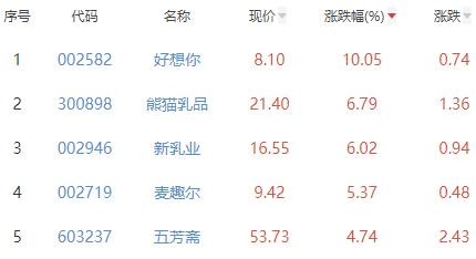 其中,好想你、熊猫乳品、新乳业、麦趣尔、五芳斋位列板块涨幅前五位,涨幅分别为10.05%、6.79%、6.02%、5.37%、4.74%。