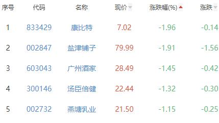 康比特、盐津铺子、广州酒家、汤臣倍健、燕塘乳业位列涨幅榜后五位,涨幅分别为-1.96%、-.91%、-1.45%、-1.32%、-1.15%。
