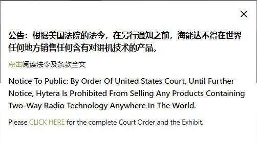 e公司讯,海能达在其公司官网公告称,根据美国法院的法令,在另行通知之前,海能达不得在世界任何地方销售任何含有对讲机技术的产品。