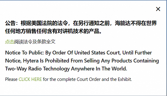 4月7日在其公司官网公告称,根据美国法院的法令,在另行通知之前,海能达不得在世界任何地方销售任何含有对讲机技术的产品。