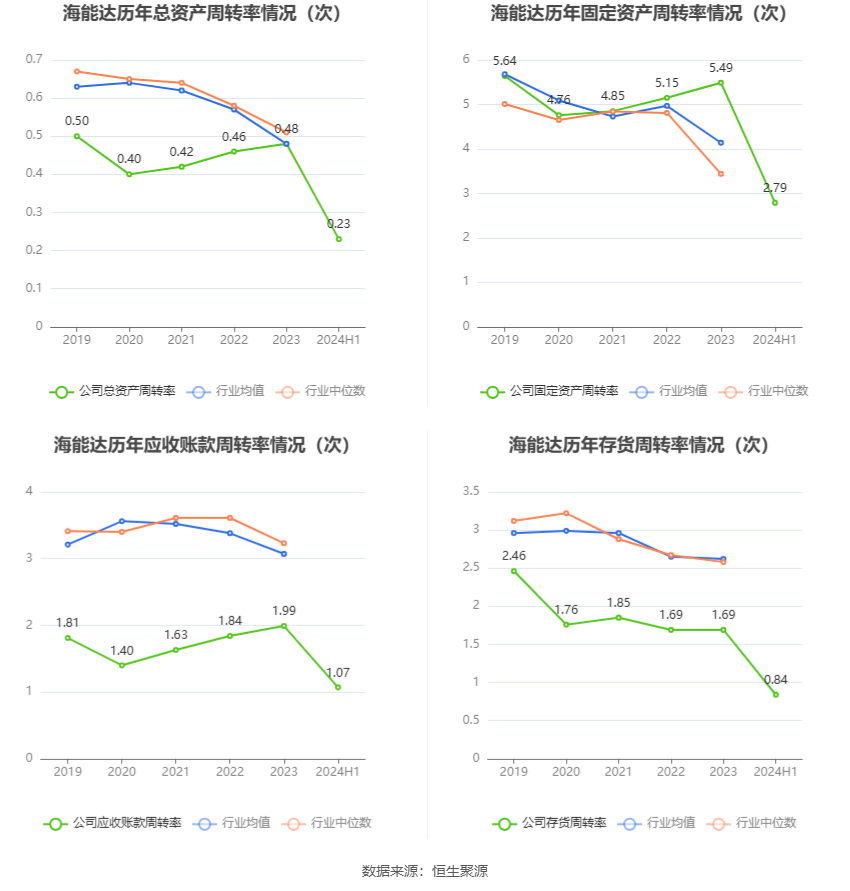 营运能力方面,2024年上半年,公司公司总资产周转率为0.23次,上年同期为0.20次(2023年上半年行业平均值为0.22次,公司位居同行业25/37);固定资产周转率为2.79次,上年同期为2.16次(2023年上半年行业平均值为2.01次,公司位居同行业16/37);公司应收账款周转率、存货周转率分别为1.07次、0.84次。