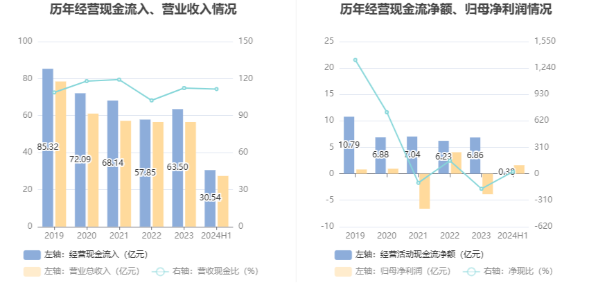 2024年上半年,公司营业收入现金比为111.54%,净现比为23.56%。