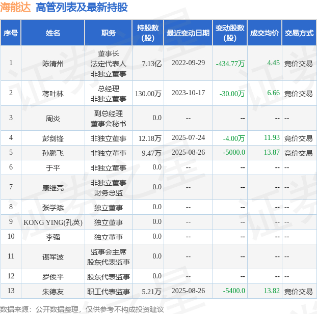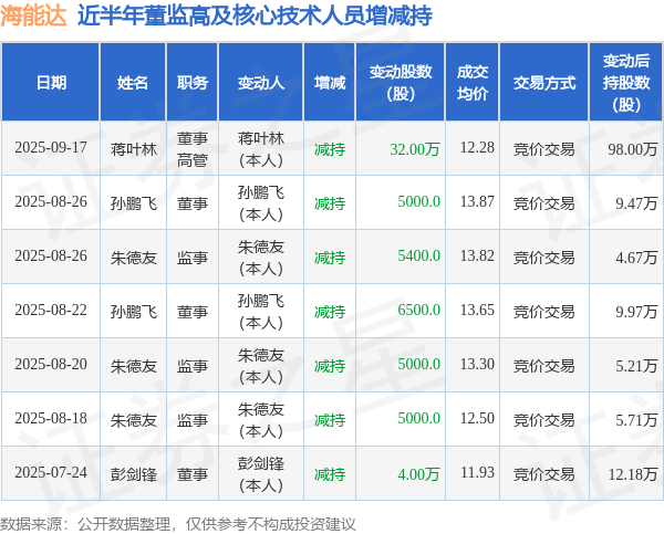 证券之星消息,根据9月18日市场公开信息、上市公司公告及交易所披露数据整理,海能达(002583)最新董监高及相关人员股份变动情况:2025年9月17日公司董事,高管蒋叶林共减持公司股份32.0万股,占公司总股本为0.0176%。变动期间公司股价下跌0.41%,9月17日当日收盘报12.27元。