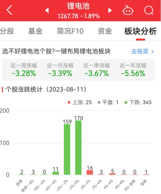 中国经济网北京8月11日讯今日,锂电池板块整体跌幅1.89%,其中25只股票上涨,1只股票平盘,345只股票下跌。