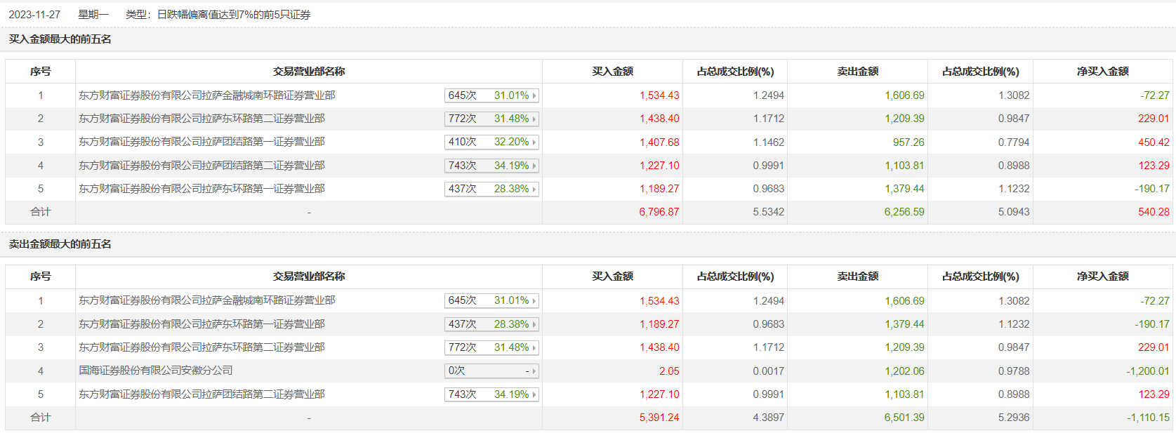 西陇科学11月27日跌停,全天换手率达29.68%,振幅达8.66%。龙虎榜数据显示,营业部席位合计净卖出659.73万元。其中,东方财富证券拉萨金融城南环路证券营业部、东方财富证券拉萨东环路第一证券营业部分别卖出1606.69万元、1379.44万元;东方财富证券拉萨金融城南环路证券营业部、东方财富证券拉萨东环路第二证券营业部分别买入1534.43万元、1438.40万元。