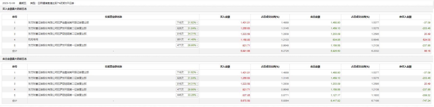 12月8日,西陇科学(维权)今日跌停,全天换手率达25.77%,振幅达7.1%。龙虎榜数据显示,营业部席位合计净卖出223.16万元。其中,机构买入1158.93万元,卖出634.85万元,合计净买入524.08万元。此外,东方财富证券拉萨金融城南环路证券营业部、东方财富证券拉萨东环路第二证券营业部分别卖出1468.90万元、1459.10万元;东方财富证券拉萨金融城南环路证券营业部、东方财富证券拉萨东环路第二证券营业部分别买入1431.81万元、1255.63万元。