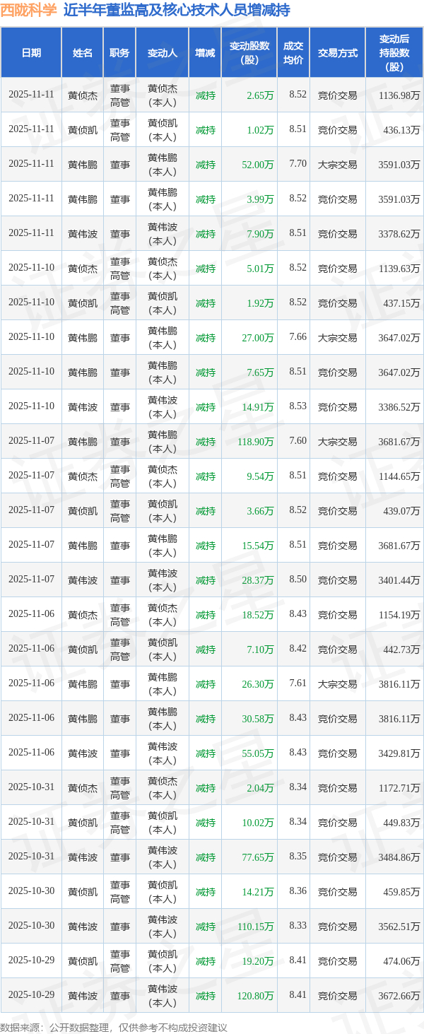 西陇科学近半年内的董监高及核心技术人员增减持详情如下:
