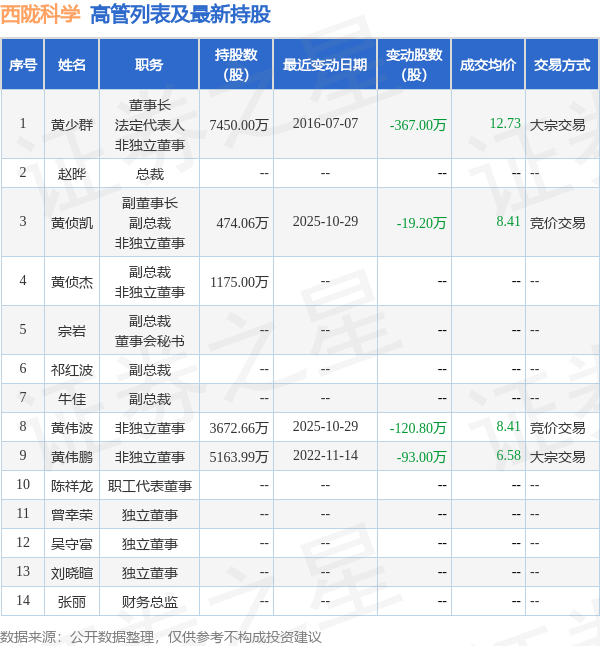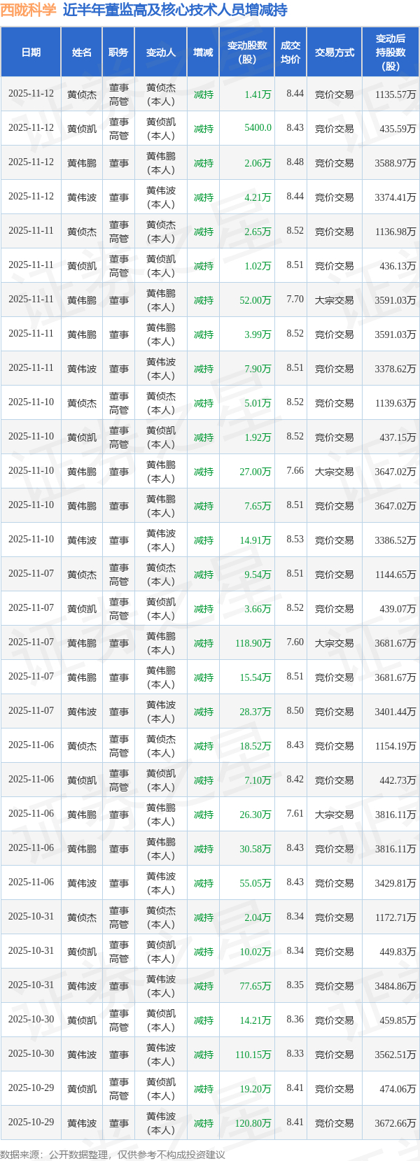 西陇科学近半年内的董监高及核心技术人员增减持详情如下: