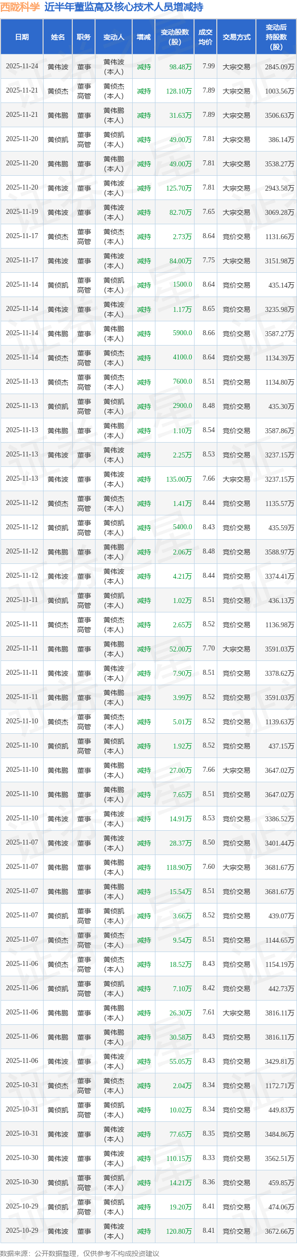 西陇科学近半年内的董监高及核心技术人员增减持详情如下: