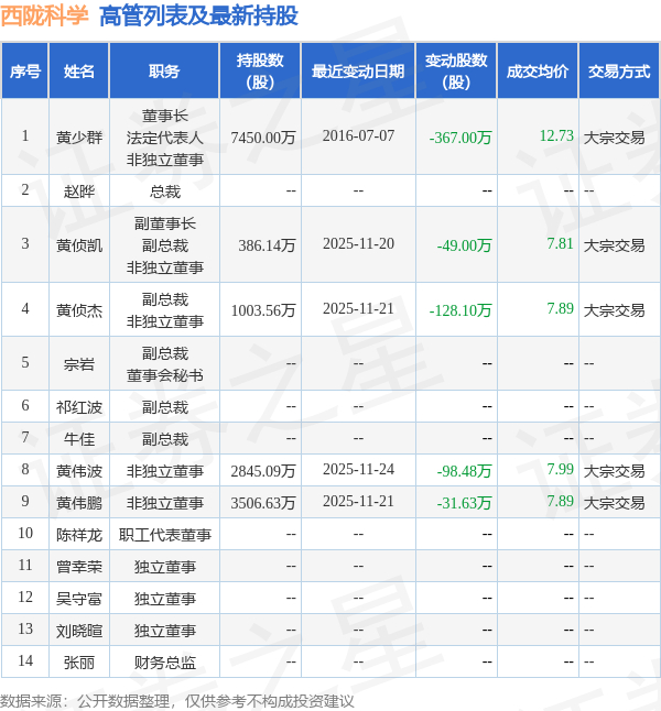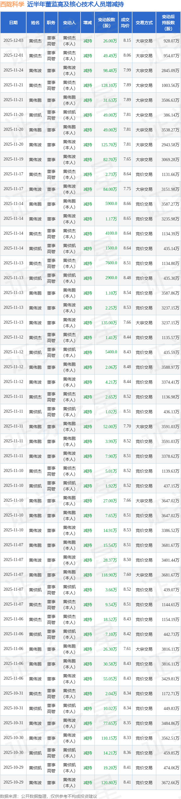 西陇科学近半年内的董监高及核心技术人员增减持详情如下: