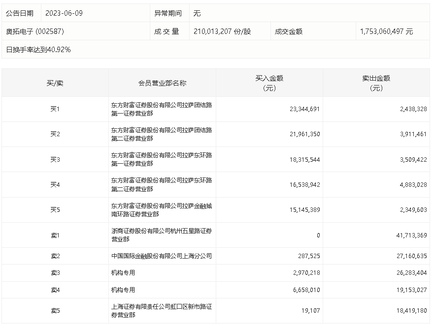 6月9日,奥拓电子今日涨4.07%,龙虎榜数据显示,上榜营业部席位全天成交2.55亿元,占当日总成交金额比例为14.55%。其中,买入金额为1.05亿元,卖出金额为1.5亿元,合计净卖出4458.07万元。