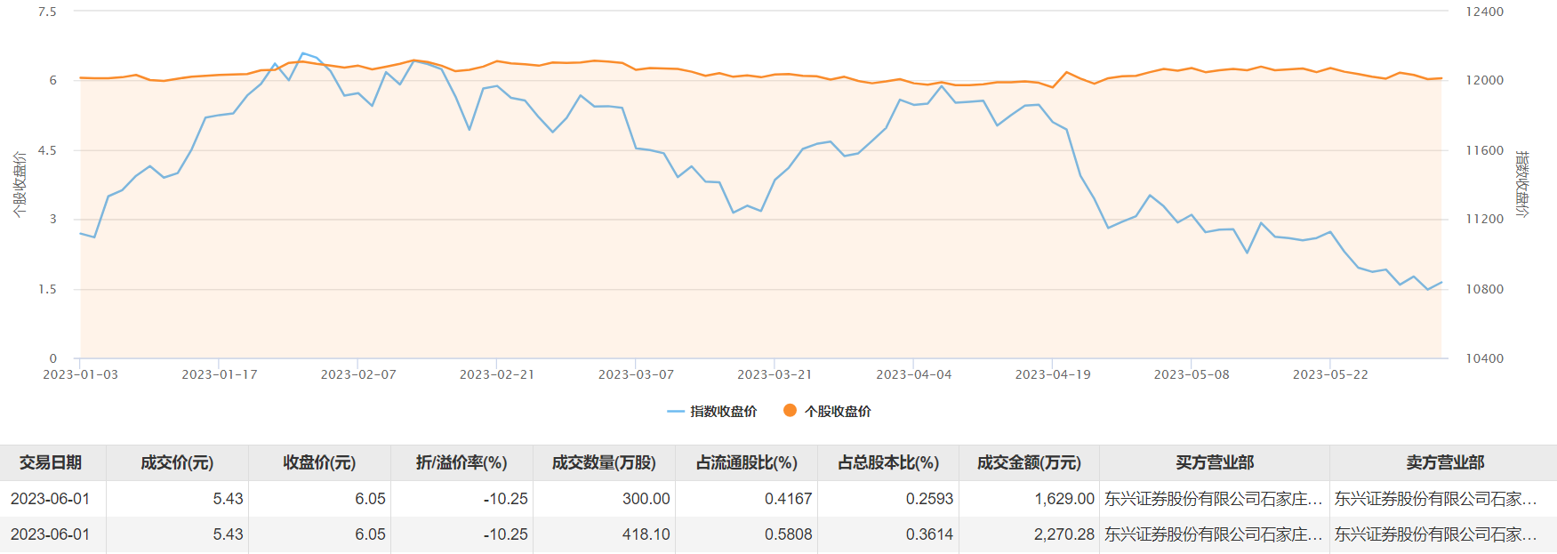6月1日大宗交易成交718.1万股,成交额3899.28万元,占当日总成交额的51.94%,成交价5.43元,较市场收盘价6.05元折价10.25%。