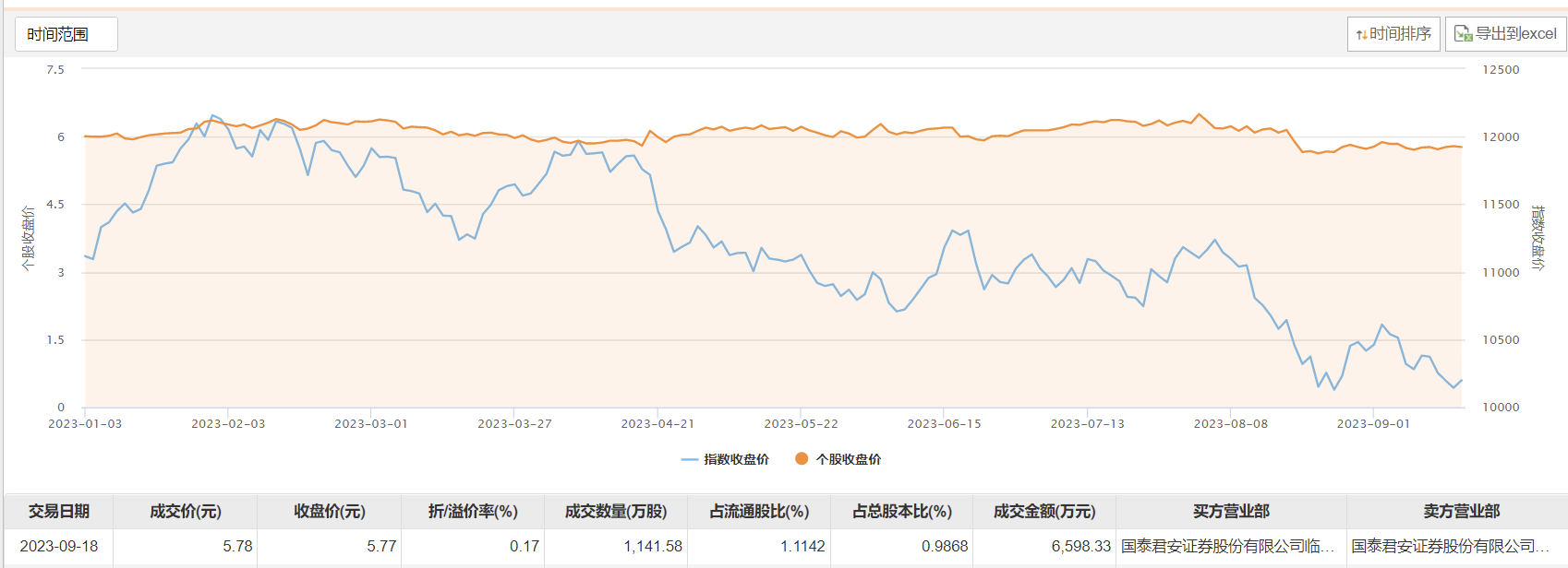 9月18日大宗交易成交1141.58万股,成交额6598.33万元,占当日总成交额的60.22%,成交价5.78元,较市场收盘价5.77元溢价0.17%。