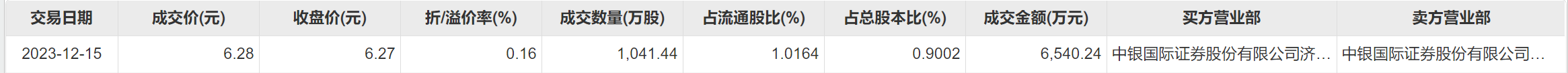 今日大宗交易成交1041.44万股,成交额6540.24万元,占当日总成交额的60.5%,成交价6.28元,较市场收盘价溢价0.16%。