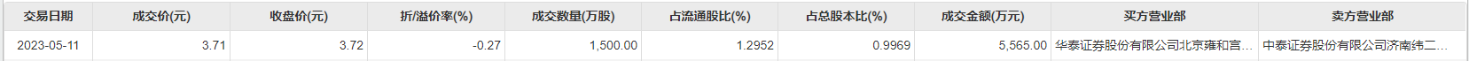 5月11日大宗交易成交1500万股,成交额5565万元,占当日总成交额的60.16%,成交价3.71元,较市场收盘价3.72元折价0.27%。