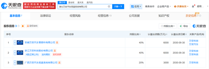 雷达财经讯,天眼查App显示,近日,湖北万安汽车底盘系统有限公司成立,法定代表人为赵永大,注册资本1.5亿人民币,经营范围包括汽车零部件及配件制造、汽车零部件研发、汽车零配件零售等,由万安科技(002590)及旗下安徽万安汽车零部件有限公司、广西万安汽车底盘系统有限公司共同持股。