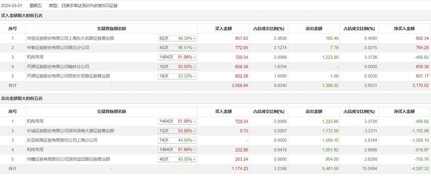 具体来看,机构买入961.28万元,卖出2275.87万元,合计净卖出1314.59万元。此外,华宝证券上海东大名路证券营业部、中泰证券湖北分公司分别买入857.83万元、772.04万元;长城证券深圳深南大道证券营业部、东亚前海证券上海分公司分别卖出1172.58万元、1059.10万元。