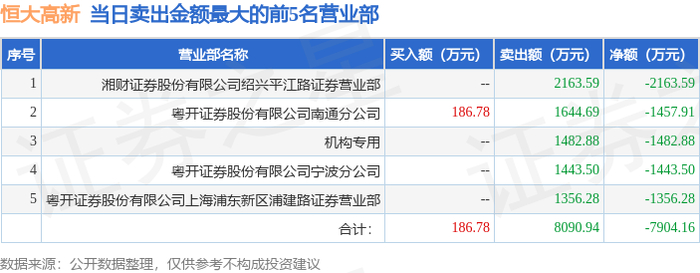 12月31日恒大高新(002591)龙虎榜数据:机构净卖出1482.88万元