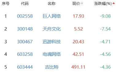 巨人网络、天舟文化、迅游科技、电魂网络、吉比特位列涨幅榜后五位,涨幅分别为-9.08%、-7.54%、-4.71%、-4.56%、-4.36%。