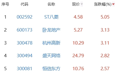 其中,ST八菱、卧龙地产、杭州高新、盛天网络、恒信东方位列板块涨幅前五位,涨幅分别为5.05%、3.13%、3.11%、2.82%、2.57%。