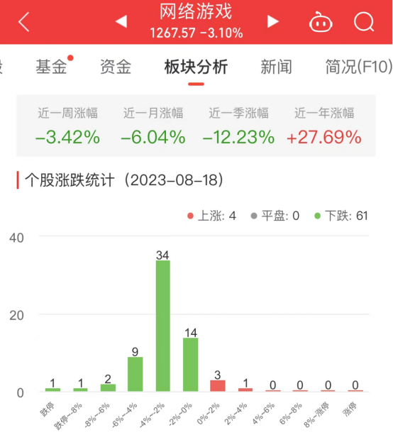 中国经济网北京8月18日讯今日,网络游戏板块整体跌幅3.10%,其中4只股票上涨,0只股票平盘,61只股票下跌。