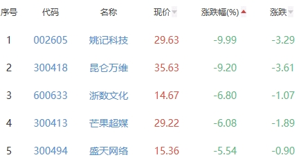 姚记科技、昆仑万维、浙数文化、芒果超媒、盛天网络位列涨幅榜后五位,涨幅分别为-9.99%、-9.20%、-6.80%、-6.08%、-5.54%。