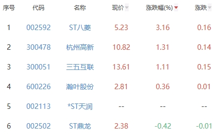 其中,ST八菱、杭州高新、三五互联、瀚叶股份、ST鼎龙位列板块涨幅前五位,涨幅分别为3.16%、1.31%、1.11%、0.36%、-0.42%。