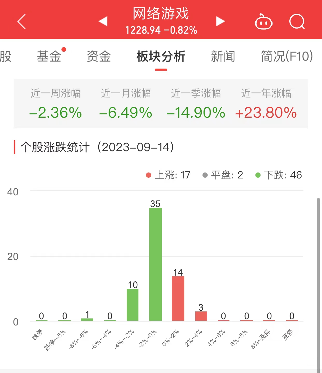中国经济网北京9月14日讯今日,网络游戏板块整体跌幅0.82%,其中17只股票上涨,2只股票平盘,46只股票下跌。