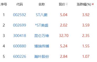 其中,ST八菱、*ST美盛、昆仑万维、博瑞传播、博瑞传播位列板块涨幅前五位,涨幅分别为3.92%、3.59%、2.35%、1.55%、1.07%。