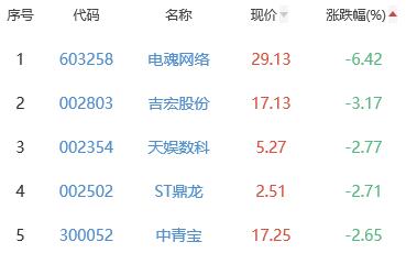 电魂网络、吉宏股份、天娱数科、ST鼎龙、中青宝位列涨幅榜后五位,涨幅分别为-6.42%、-3.17%、-2.77%、-2.71%、-2.65%。