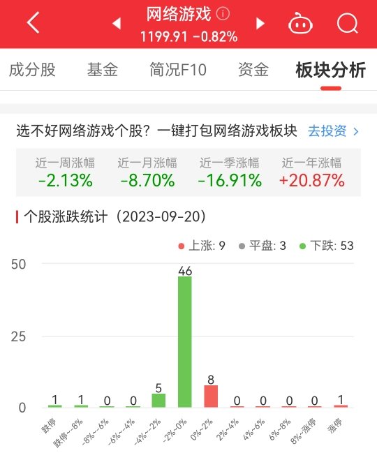 中国经济网北京9月20讯今日,网络游戏板块整体跌幅0.82%,其中9只股票上涨,3只股票平盘,53只股票下跌。