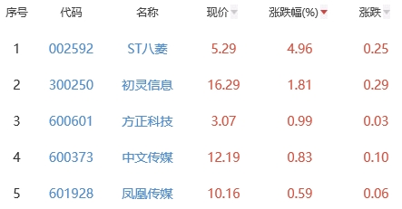 其中,ST八菱、初灵信息、方正科技、中文传媒、凤凰传媒位列板块涨幅前五位,涨幅分别为4.96%、1.81%、0.99%、0.83%、0.59%。