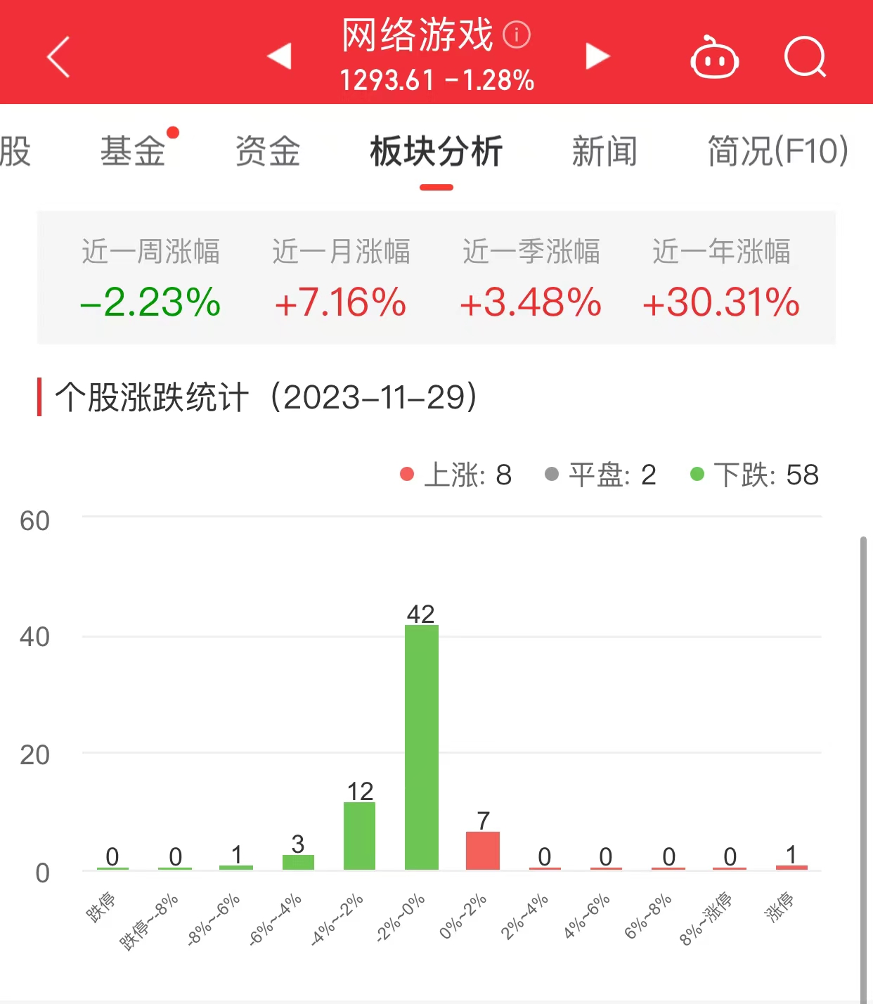 中国经济网北京11月29日讯今日,网络游戏板块整体跌幅1.28%,其中8只股票上涨,2只股票平盘,58只股票下跌。