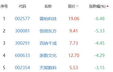 雷柏科技、恒信东方、百纳千成、浙数文化、天娱数科(维权)位列涨幅榜后五位,涨幅分别为-6.48%、-5.33%、-4.45%、-4.29%、-3.15%。