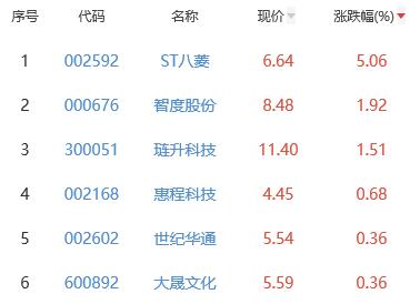 其中,ST八菱(维权)、智度股份、琏升科技、惠程科技(维权)、世纪华通(维权)、大晟文化位列板块涨幅前五位,涨幅分别为5.06%、1.92%、1.51%、0.68%、0.36%、0.36%。