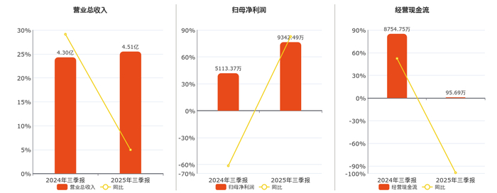 公司营业总收入为4.51亿元,在已披露的同业公司中排名第223。归母净利润为9342.49万元,在已披露的同业公司中排名第133。经营活动现金净流入为95.69万元,在已披露的同业公司中排名第217,较去年同报告期经营活动现金净流入减少8659.06万元,同比较去年同期下降98.91%。