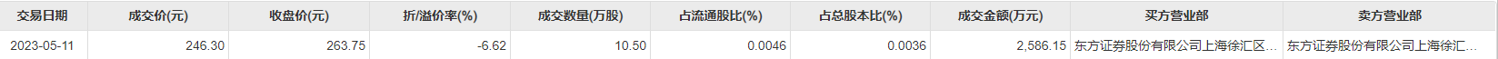 5月11日大宗交易成交10.5万股,成交额2586.15万元,占当日总成交额的0.45%,成交价246.3元,较市场收盘价263.75元折价6.62%。