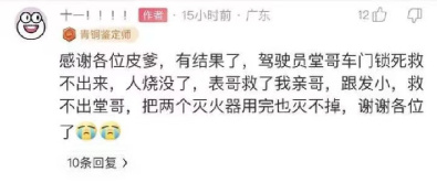与此同时,网上流传的一张截图也显示,疑似事故车辆驾驶员亲属在社交平台透露,“驾驶员堂哥车门锁死救不出来,人烧没了”。