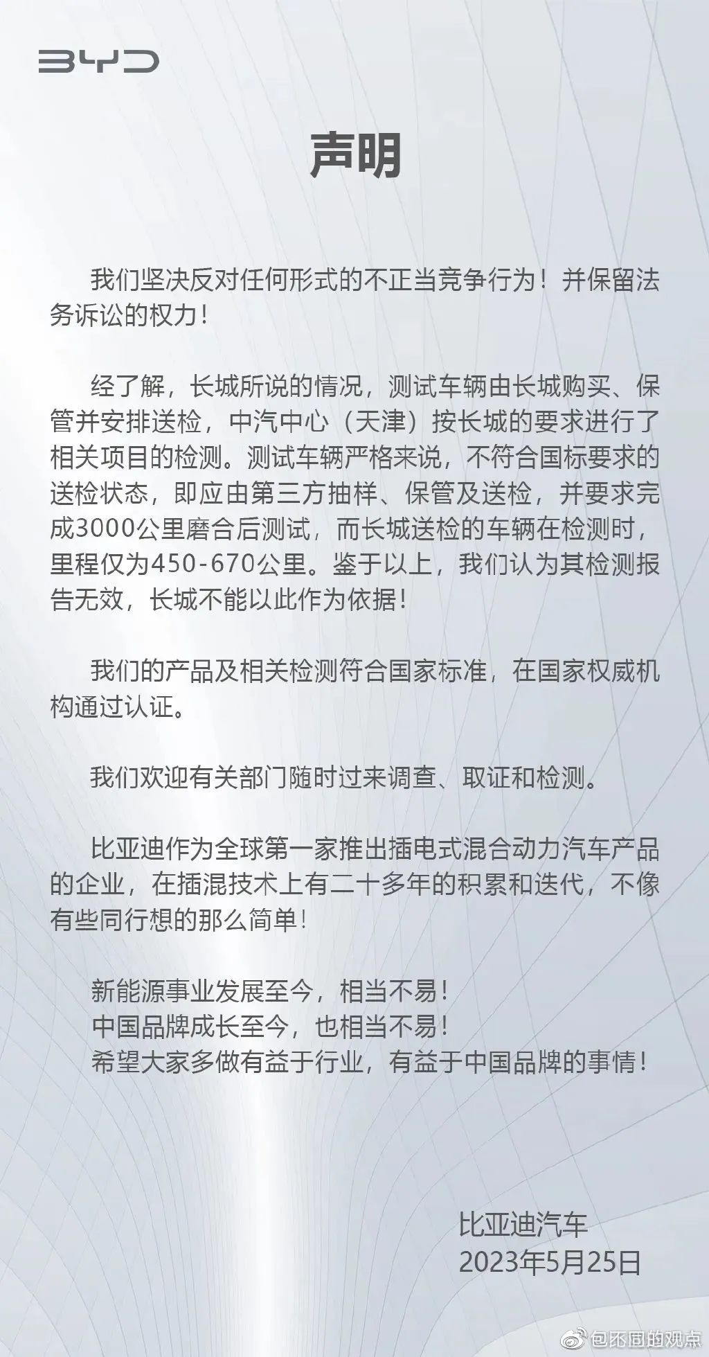 就在5月25日,长城汽车突然发出一个声明,矛头直指比亚迪。