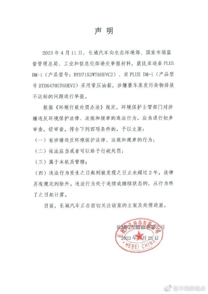 声明称,长城汽车已经于4月11日向生态环境部、国家市场监督管理总局、工业和信息化部递交举报材料,就比亚迪秦PLUS DM-i、宋PLUS DM-i采用常压油箱,涉嫌整车蒸发污染物排放不达标的问题进行举报。