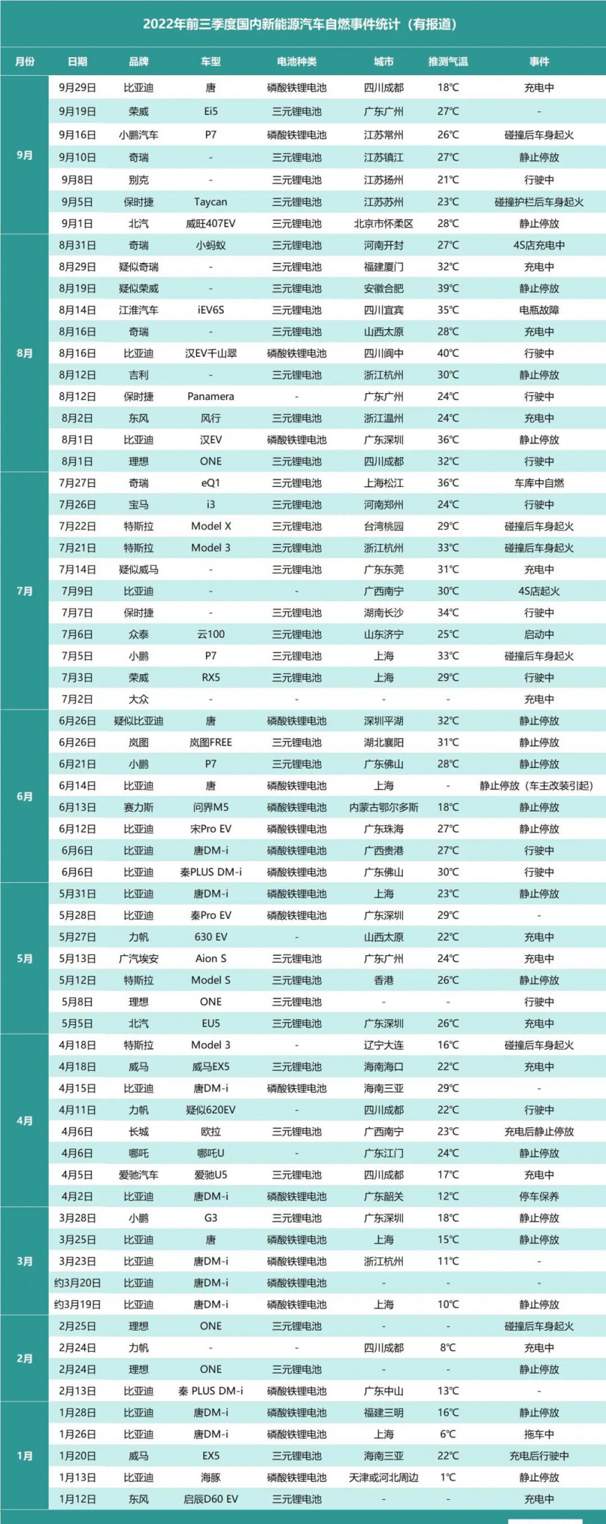 这一点,在比亚迪身上也有体现。锂猫实验室曾统计过2022年前三季度中各类网站公开报道过的、含具体品牌的国内新能源汽车自燃及起火事件(不完全)。