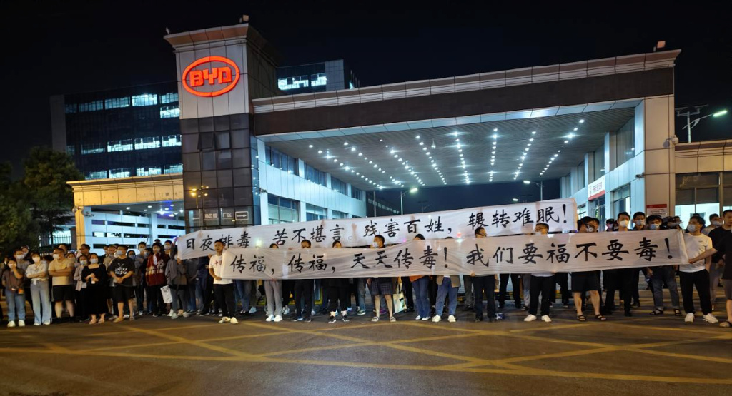 时间回到2022年5月的一个晚上,长沙市雨花区比亚迪工厂大门口,站满了周边的居民。现场拉出的横幅上写着几个大字——