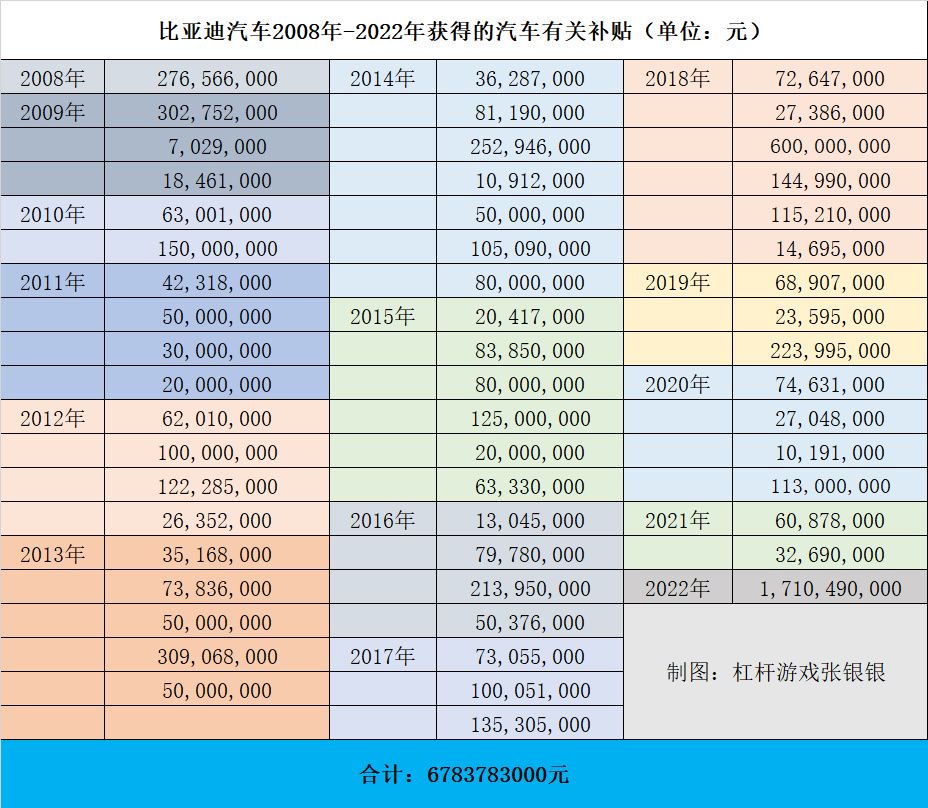 如上图,从2008年到2022年的15年间,经过翻阅年报累加,杠杆游戏计算出比亚迪汽车总计至少拿到了各类补贴、补助共计约67.84亿元。