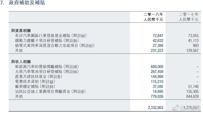 11、2018年:长沙比亚迪汽车损益表内确认的金额为72,647,000元,由长沙雨花经济开发区管理委员会提供;